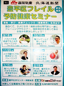 札幌市豊平区役所との共催で「豊平区フレイル予防健康セミナー」として開催。区役所保有の血管年齢測定器、脳年齢測定器、歩行姿勢測定器と森永乳業が保有する骨ウエーブによる健康測定で付加価値を高める。